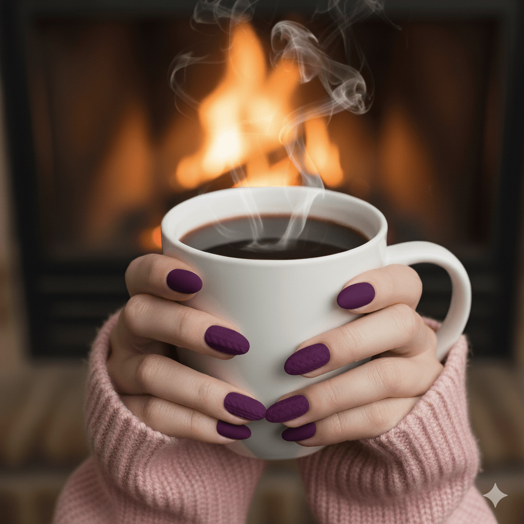Dive into the moody elegance of Fall/Winter with this rich, matte fig (deep purple/burgundy) manicure. The warmth of the color perfectly complements cozy gray knitwear. The essential sweater style is showcased on the ring finger with a stylish chevron or herringbone knit pattern, which offers a fresh, diagonal texture compared to the standard cable design. It’s a chic, trending look that feels luxurious and perfectly textured for the season.