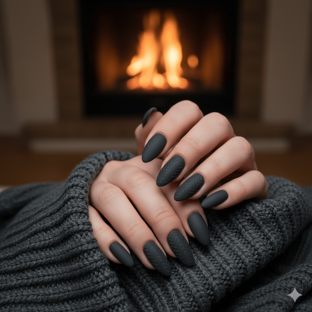 If you love a bold, high-contrast look, this matte black design is for you. The flat, velvety finish gives the color incredible depth, transforming the cozy sweater pattern into something sharp and unexpected. The cable knit texture is concentrated on the ring and middle fingers, providing a strong tactile element against the solid black nails. This design proves that cozy texture and edgy winter fashion can perfectly coexist.